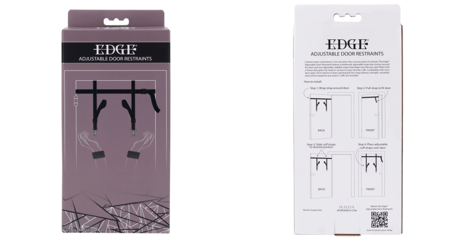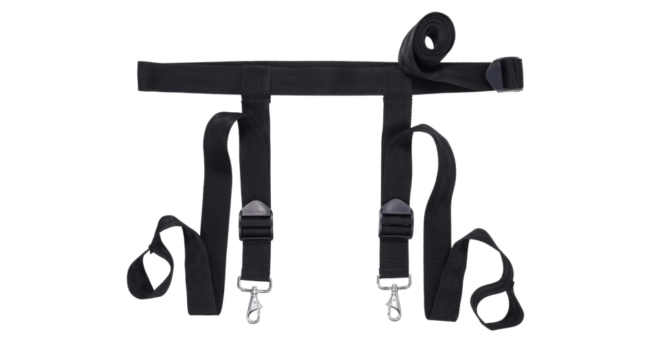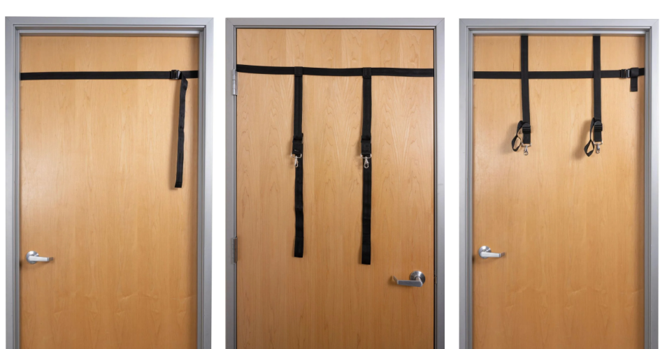 The Edge Adjustable Door Restraints feature a reinforced, adjustable strap that cinches around the door and two adjustable, slidable straps that drape over the top, each fitted with a heavy-duty gate clip ready to connect to your favorite cuffs.
