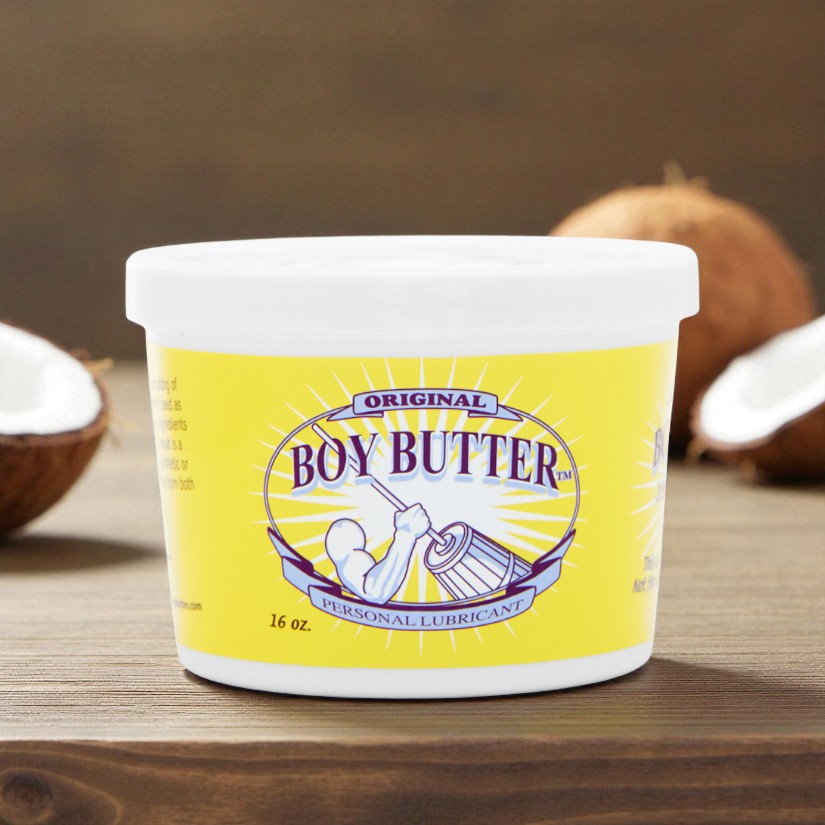 Boy Butter Original is a coconut oil-based formula that is homogenized into a creamy personal lubricant that goes clear on contact with skin and will last as long as any silicone formula.