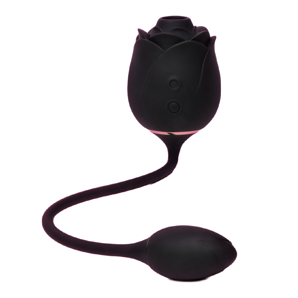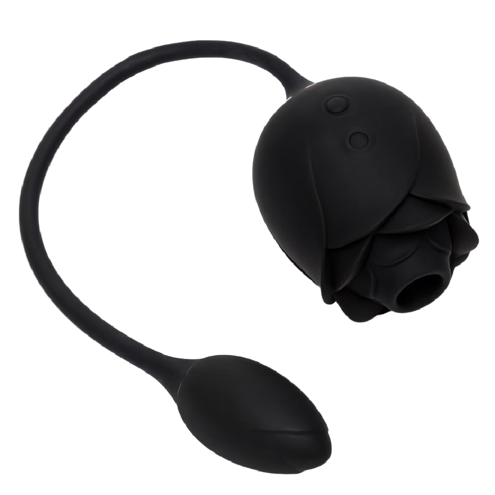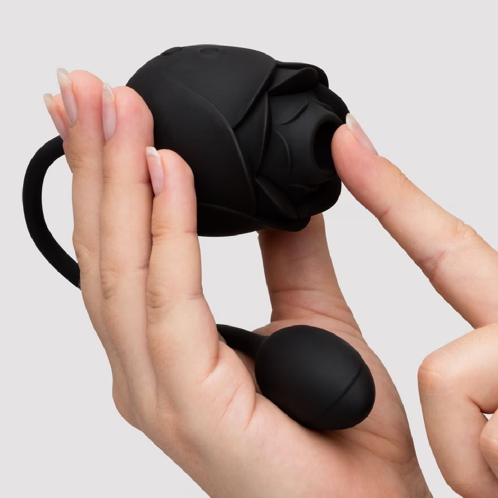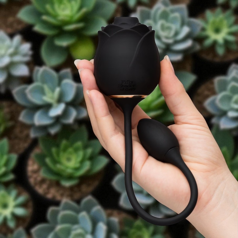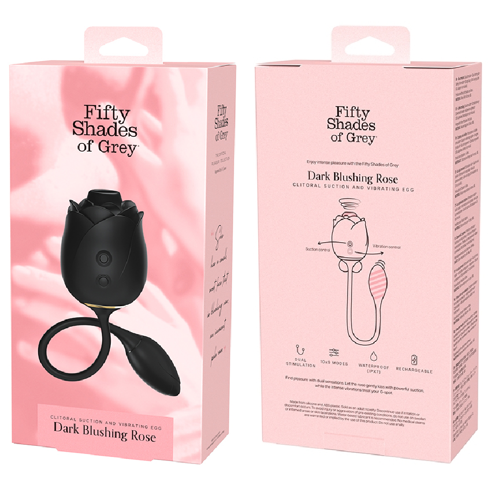 Awaken your budding desires and watch them bloom with this silky smooth silicone Dark Blushing Rose clitoral suction stimulator with attached vibrating egg from Fifty Shades of Grey.