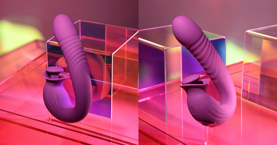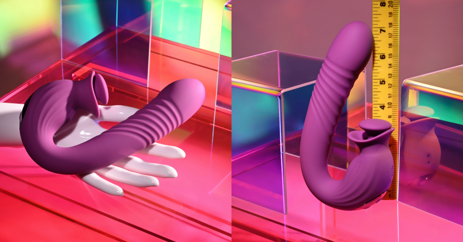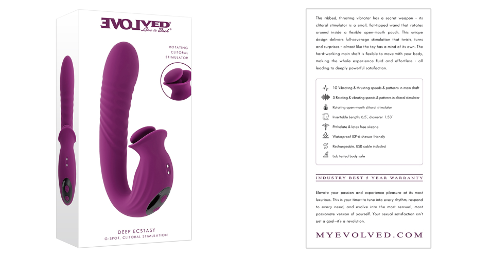 The ribbed, thrusting Deep Ecstasy has a secret weapon – its external stimulator is a small, flat-tipped wand that rotates around inside a flexible open-mouth pouch. This unique design delivers full-coverage stimulation that twists, turns and surprises – almost like the toy has a mind of its own.
