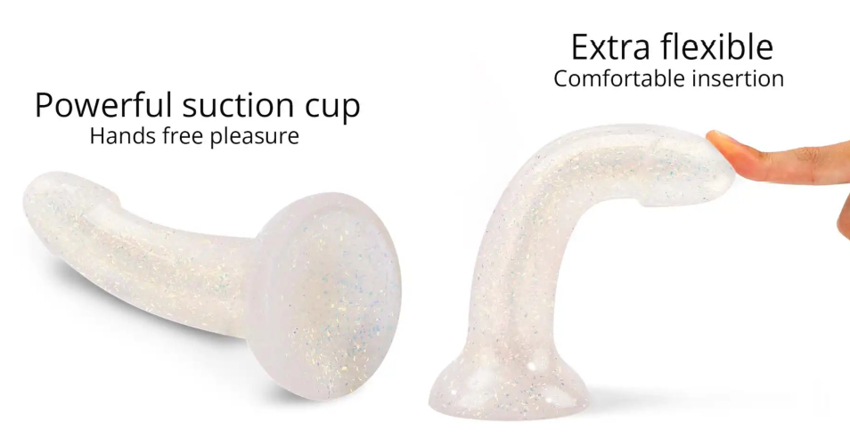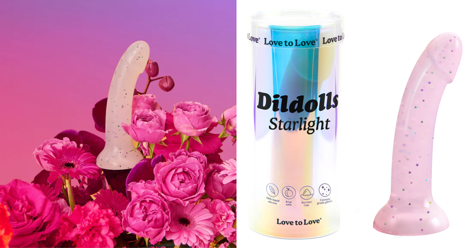 Starlight is a powder-pink dildo adorned with starry glitter of all colors.