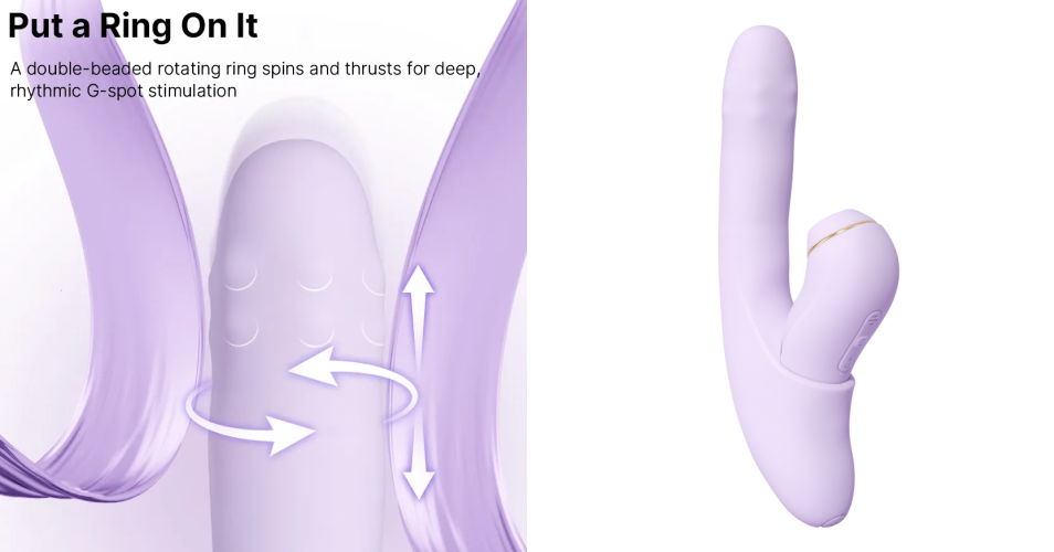 The vibrator delivers deep, rumbly vibrations and rhythmic thrusts, powered by a double-beaded rotating ring that thrusts at 85 times per minute and rotates at 270 times per minute.