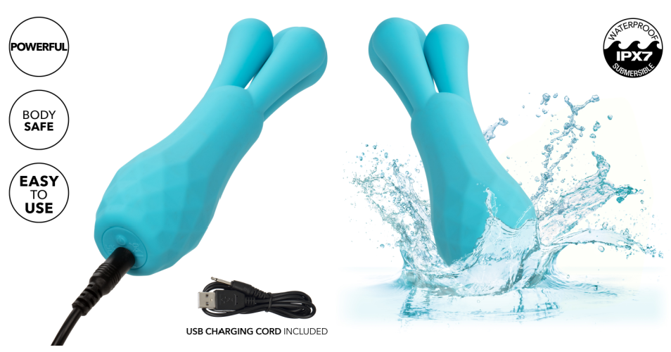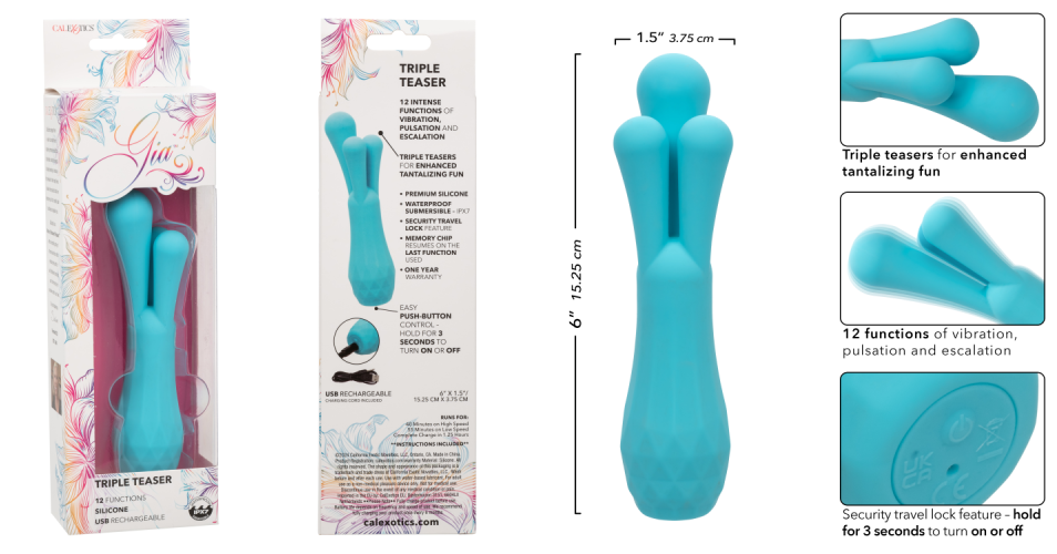 The USB rechargeable Gia Triple Teaser is waterproof and submersible for fun in & out of the water and easy cleanup.