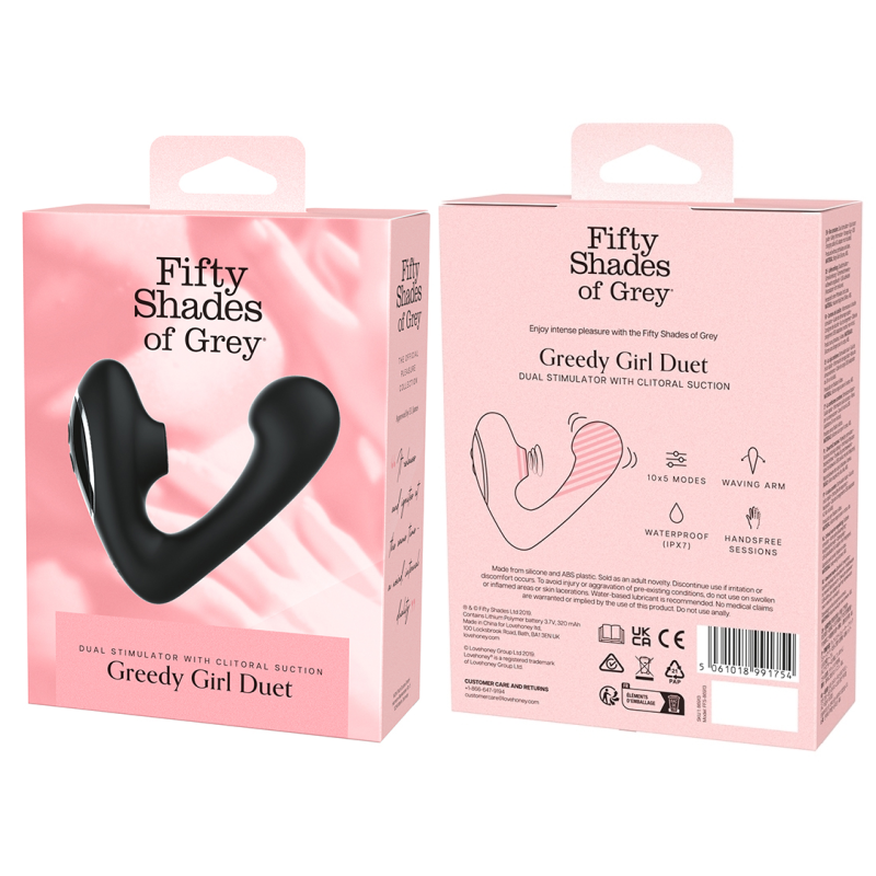 Writhe in ecstasy as you bless yourself with the separate or blended bliss of powerful clitoral massage and a moving wave motion of delicious internal stimulation. The FSOG Greedy Girl Duet is all that and more.