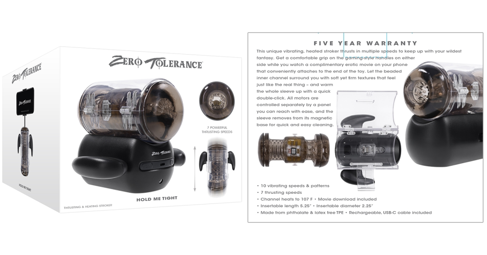 The unique vibrating, Hold Me Tight heated stroker thrusts in multiple speeds to keep up with your wildest fantasy.