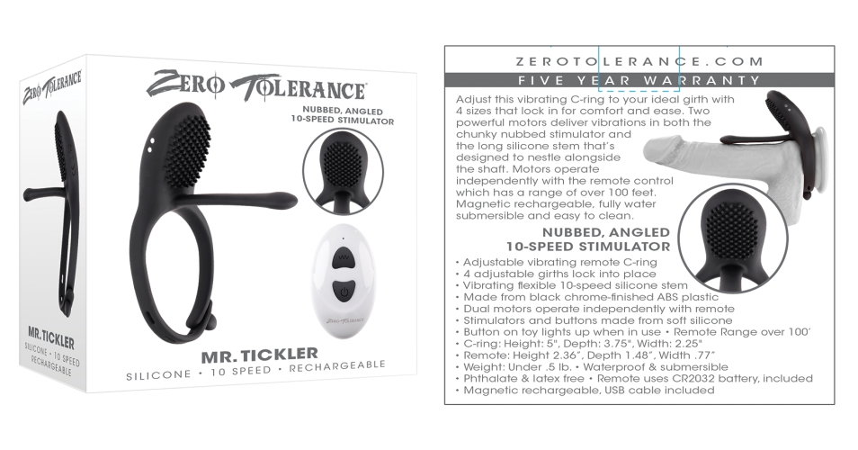 Mr. Tickler’s dual motors operate independently with the remote control which has a range of over 100 feet. Explore ten modes of vibration, pulsation, and escalation at the touch of a button.