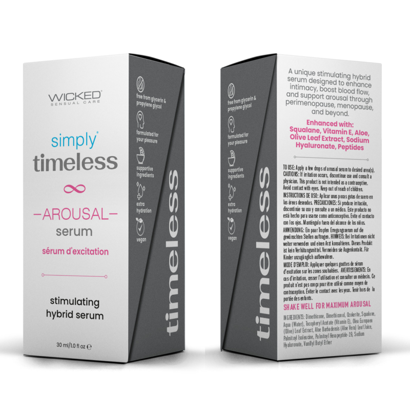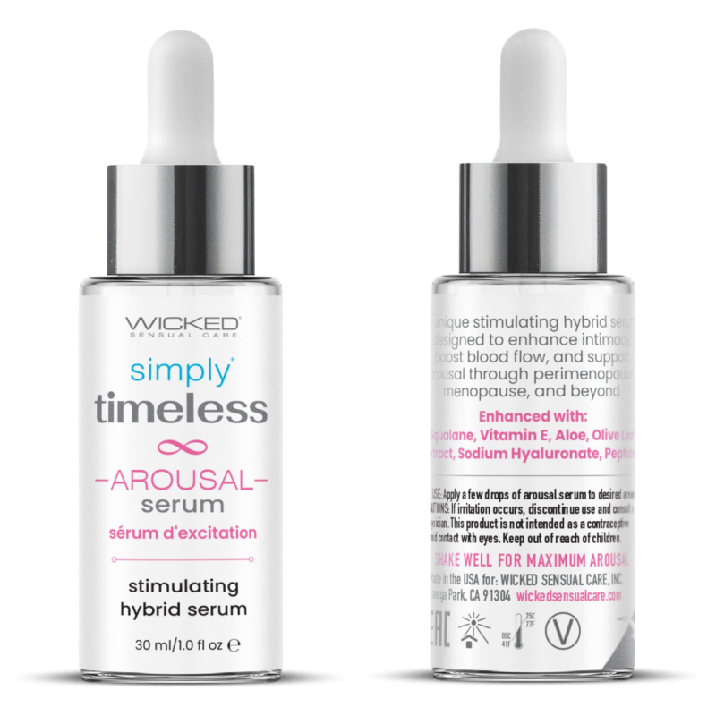 simply timeless Arousal Serum contains Wicked Sensual Care’s signature supportive ingredients that the timeless collection features, as well as amino acids and peptides.