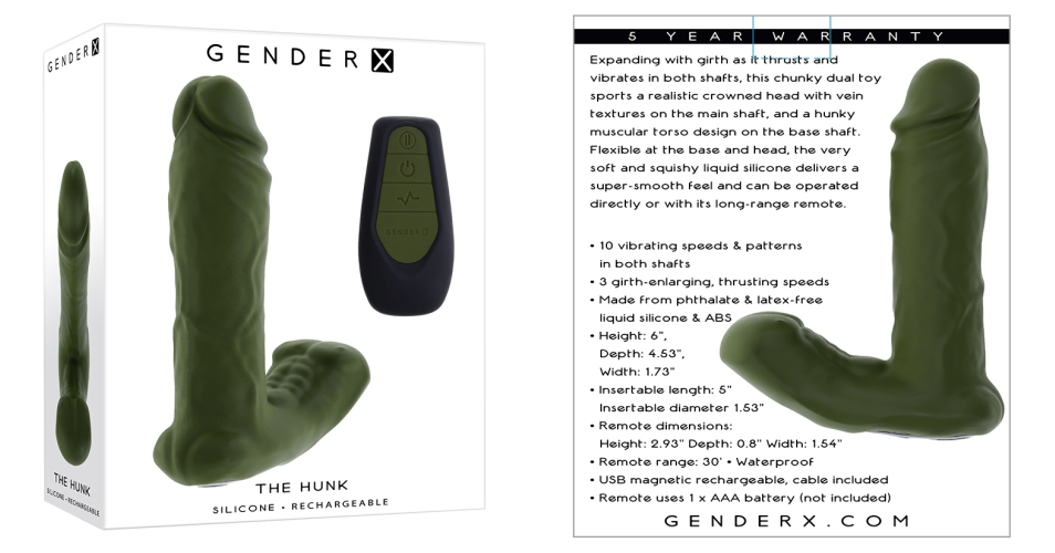 Expanding with girth as it thrusts and vibrates in both shafts, the chunky The Hunk dual toy sports a realistic crowned head with vein textures on the main shaft, and a hunky male torso design on the base shaft.