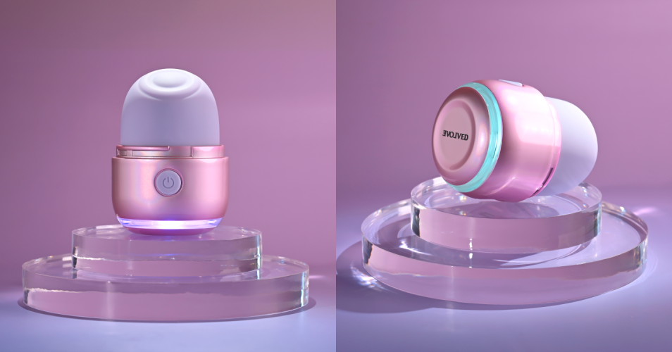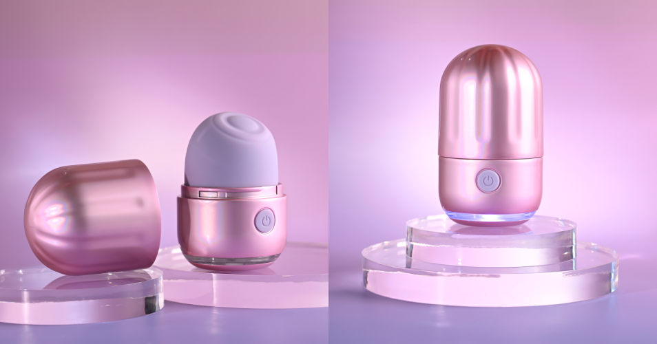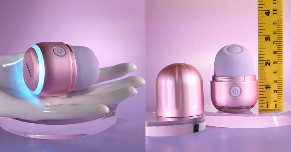 The discreet textured canister lid pops off to reveal the rounded silicone tapping head. A colorful changing light in the base and a one-touch control button make it effortless to navigate.
